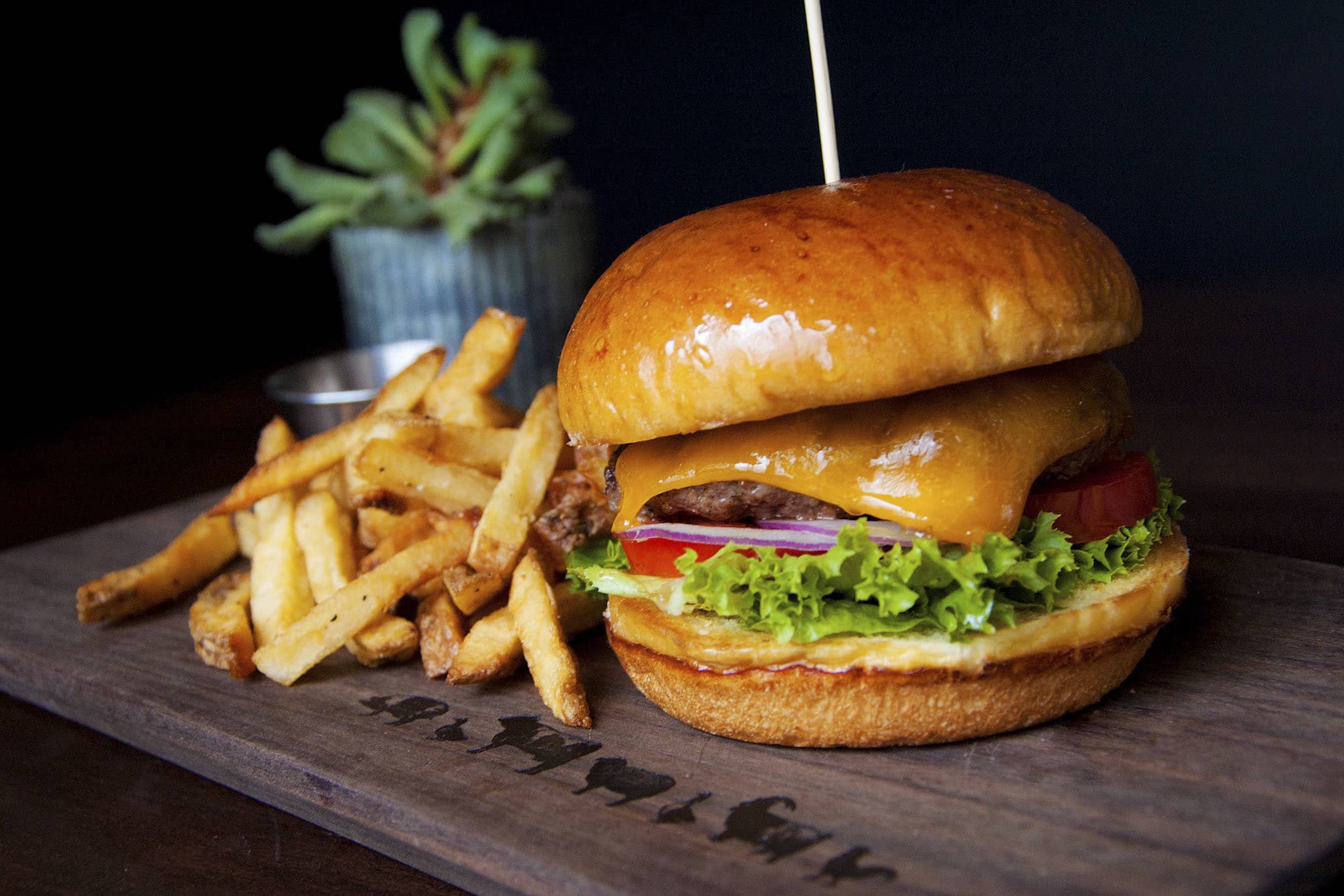 Burger Köftesi, Cheddar Peyniri, Karamelize Soğan, Ranch Sos, Marul, Domates, Turşu ve Baharatlı Patates Kızartması ile servis edilir.