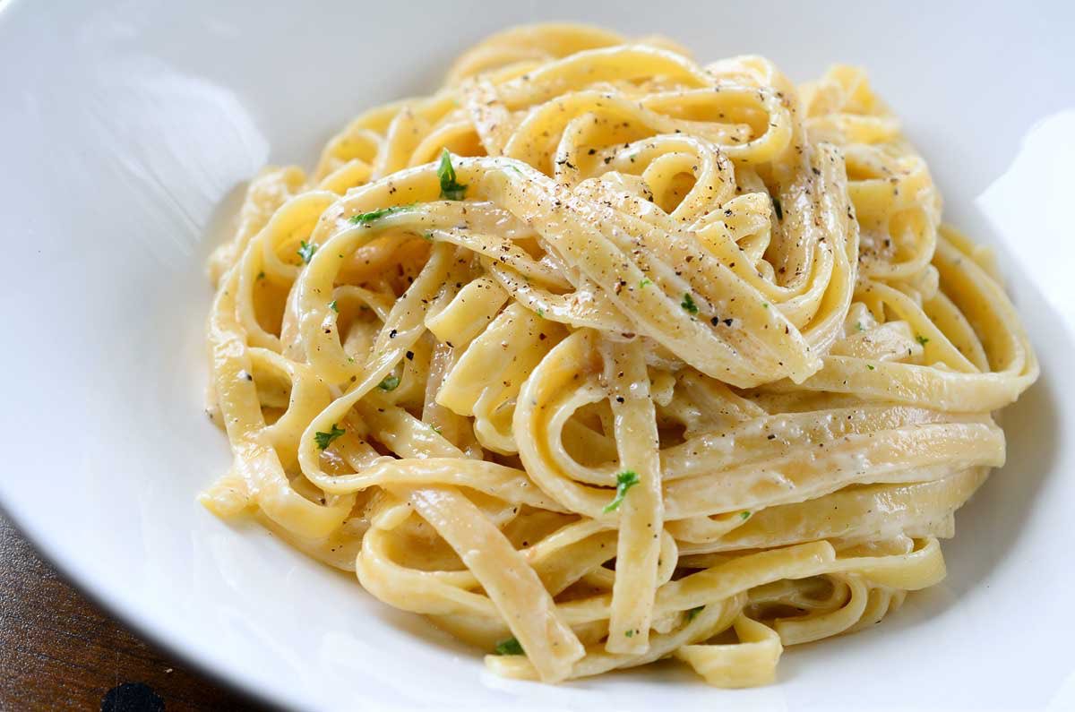 Fettuccine makarna, Mantar, Pesto Sosu ve Tavuk parçaları ile servis edilir.